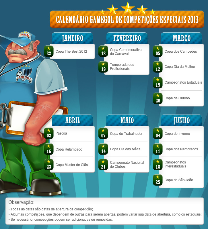 Informamos que a temporada dos profissionais, agendada no dia 19, corresponde à data de inauguração do campeonato seriado que envolverá todas as equipes do GameGol, independentemente do nível. Após sua realização, observa-se o tempo de inter-temporada (durante a qual ocorrem as copas especiais) e, em seguida, inicia-se outro, conforme comunicação anterior.